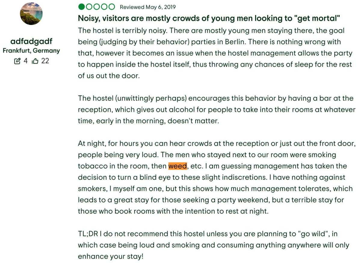 In einer Bewertung wird sogar erwähnt, dass Gäste nebenan nicht nur laut waren, sondern auch geraucht haben – inklusive Cannabis.