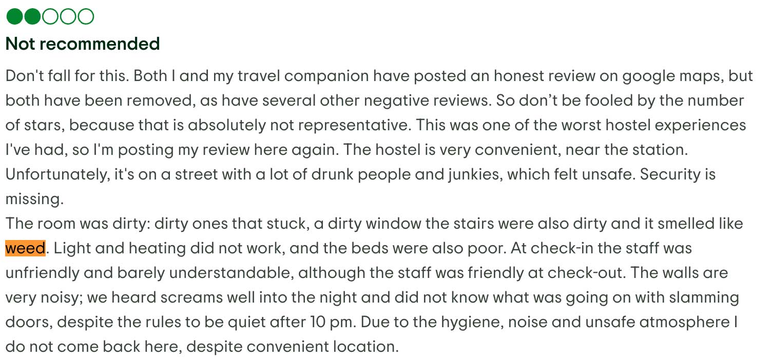 In einzelnen Gästestimmen wird erwähnt, dass es gelegentlich zu Geruchsentwicklungen im Gebäude kommen kann, die auf Konsum im Umfeld hindeuten.